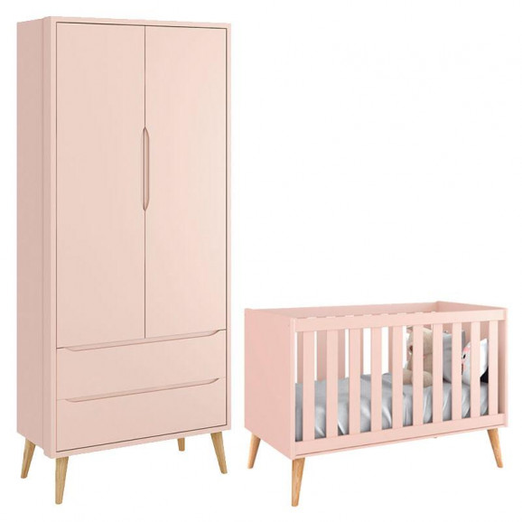 Berço Americano e Guarda Roupa Theo 2 Portas Rosa com Pés Madeira Natural – Reller