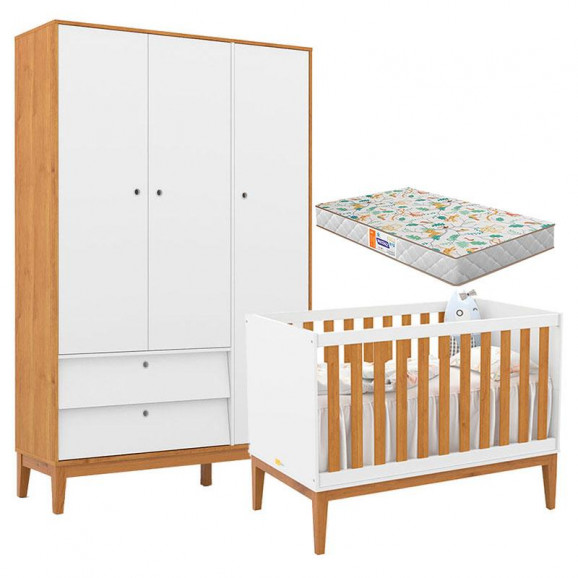 Berço Americano e Guarda Roupa Unique 3 Portas Branco Soft Freijó Eco Wood com Colchão Gazin - Matic