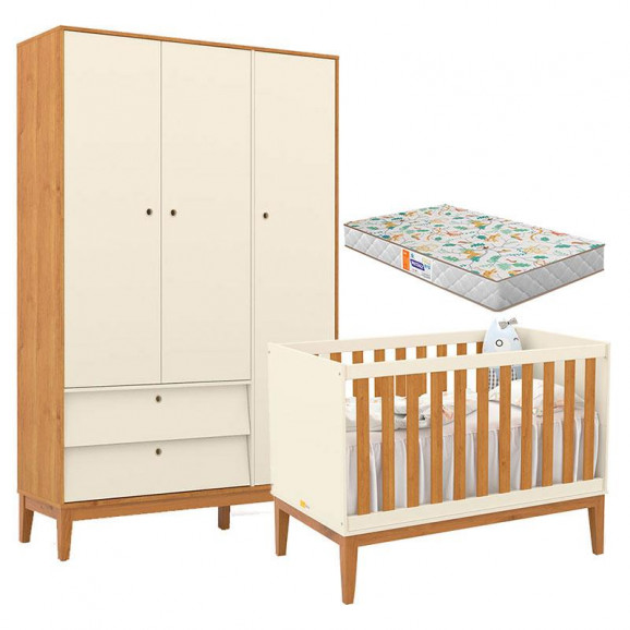 Berço Americano e Guarda Roupa Unique 3 Portas Off White Freijó Eco Wood com Colchão Gazin - Matic