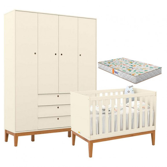 Berço Americano e Guarda Roupa Unique 4 Portas Off White Eco Wood com Colchão Gazin - Matic
