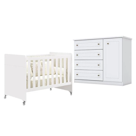 Conjunto Berço Americano Evolution 4 em 1 Reller Branco Acetinado e Cômoda Americano Henn Branco HP, ideal para um quarto de bebê funcional e moderno. O berço 4 em 1 acompanha o crescimento da criança, oferecendo versatilidade, conforto e segurança, enquanto a cômoda garante praticidade e organização no dia a dia. Design elegante, ótimo acabamento e qualidade das marcas Reller e Henn.