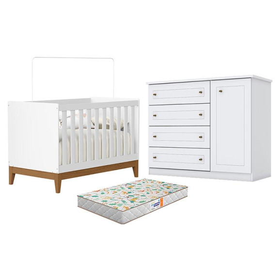 Berço Americano Flip Branco Acetinado Reller e Cômoda Infantil Americano Brando HP com Colchão Gazin - Henn
