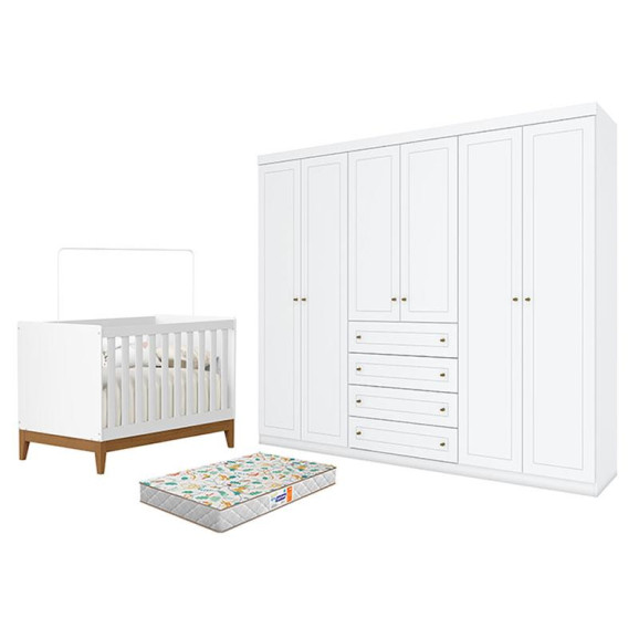 Berço Americano Flip Branco Acetinado Reller e Guarda Roupa Casal Americano 6 Portas Branco HP com Colchão Gazin – Henn