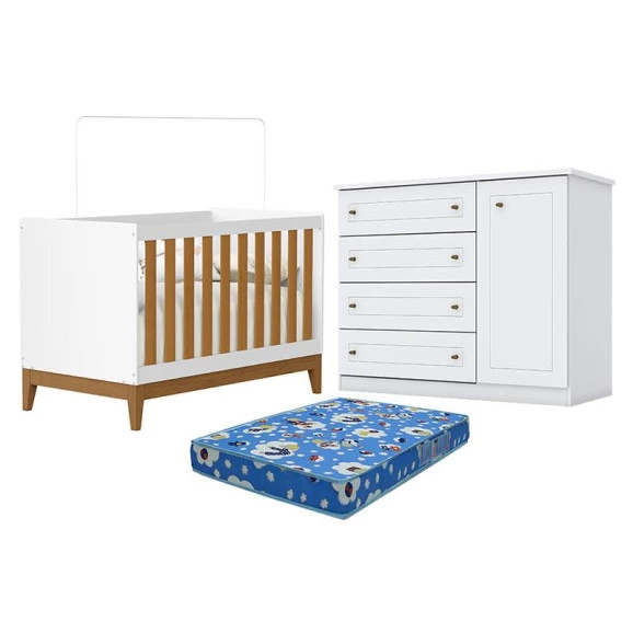 Berço Americano Flip Branco Acetinado Savana Reller e Cômoda Infantil Americano Brando HP com Colchão Ortobom - Henn
