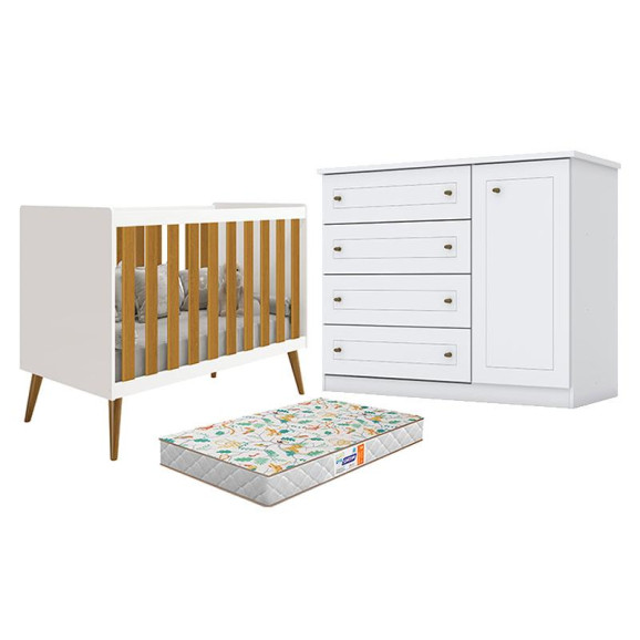 Berço Americano Isis Branco Acetinado Savana - Reller e Cômoda Infantil Americano Branco HP com Colchão Gazin - Henn