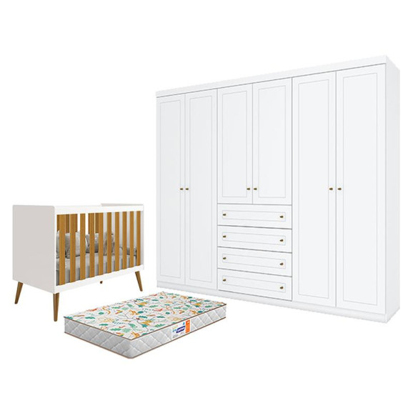 Berço Americano Isis Branco Acetinado Savana - Reller e Guarda Roupa Casal Americano 6 Portas Branco HP com Colchão Gazin – Henn