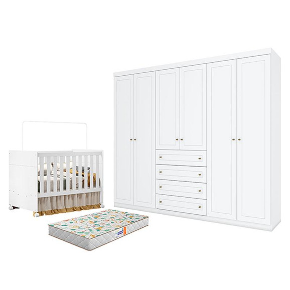 Berço Americano Katatau Branco Acetinado – Reller e Guarda Roupa Casal Americano 6 Portas Branco HP com Colchão Gazin – Henn