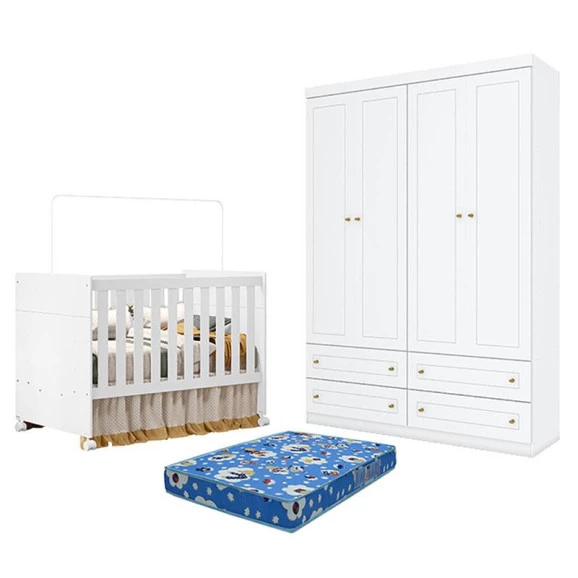 Berço Americano Katatau Branco Acetinado - Reller e Guarda Roupa Infantil Americano 4 Portas Branco HP com Colchão Ortobom – Henn