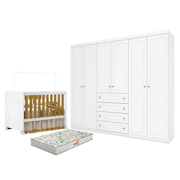 Berço Americano Katatau Branco Acetinado Savana – Reller e Guarda Roupa Casal Americano 6 Portas Branco HP com Colchão Gazin – Henn
