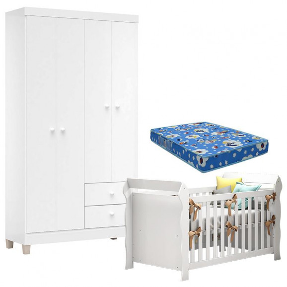 Berço Americano Lara com Colchão e Guarda Roupa Ternura Baby 4 Portas Branco Flex - Incorplac