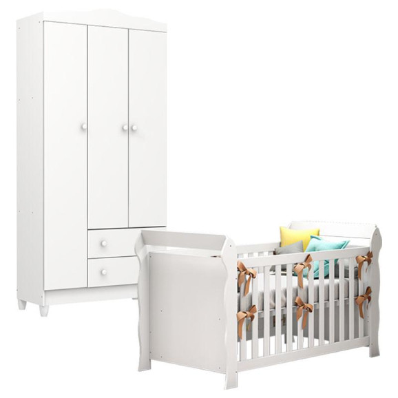 Berço Americano Lara com Guarda Roupa Infantil Mel Flat 3 Portas Branco Brilho – Carolina