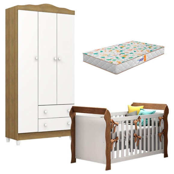 Berço Americano Lara e Guarda Roupa Infantil Mel Flat 3 Portas Branco Acetinado Amadeirado com Colchão Gazin – Carolina