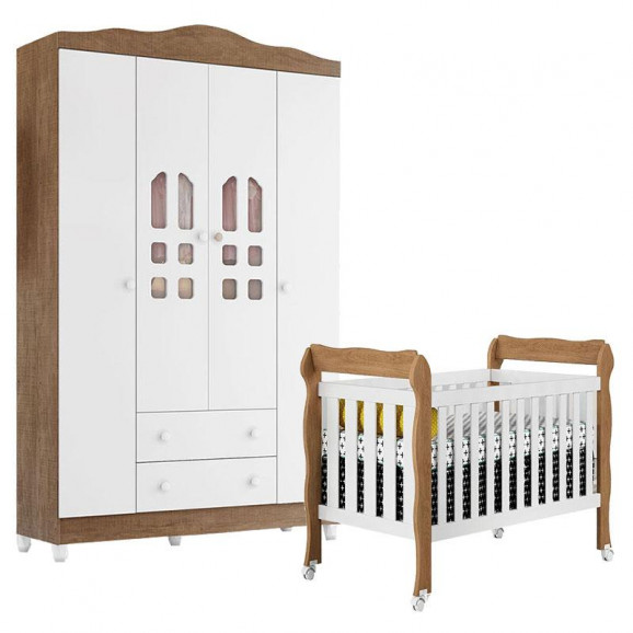 Berço Americano Lila e Guarda Roupa Infantil New Selena 4 Portas Branco Acetinado Amadeirado - Carolina