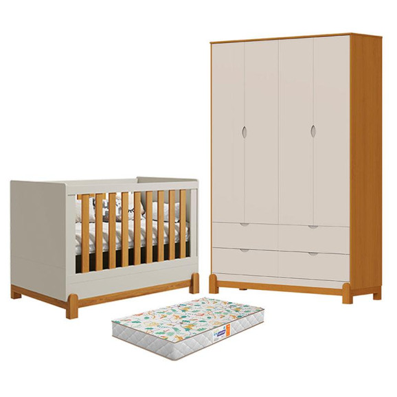 Berço Americano Lótus Liso Areia Savana com Guarda Roupa Infantil Lotus Liso 4 Portas Areia Savana com Colchão Gazin - Reller