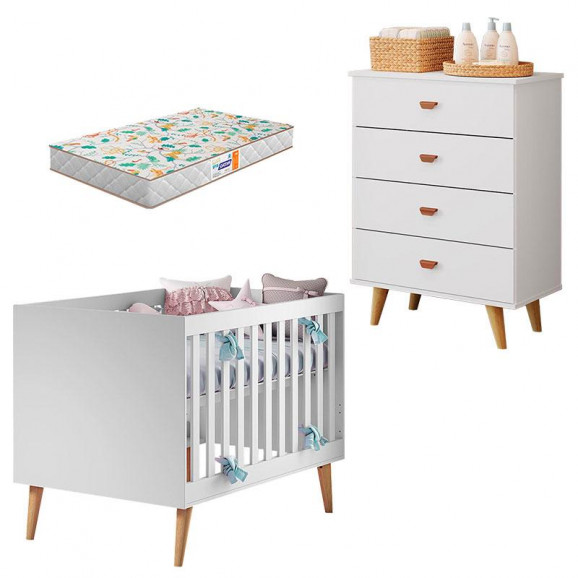 Procurando por móveis para o quarto do bebê, e esta em dúvida de qual modelo escolher, apresentamos a vocês essa linda opção composta por Berço Americano da linha Ludmila e Cômoda Infantil com 4 Gavetas da linha Duda ambos desenvolvidos pela Carolina Baby pensando no conforto do bebê e da mamãe, possui amplo espaço interno para maior praticidade e organização das roupinhas, sapatinhos e acessórios, sistema de Travas Anti-Tombamento fixados na parede evitando acidentes para maior segurança de todos, o Berço transforma-se em mini cama e sofá cama aumentando a vida útil do móvel, acompanhando as fazes de crescimento da criança, conta com lindo design na cor Branco Acetinado com Pés estilo Retrô na cor Bétula proporcionando modernidade e tranquilidade ao ambiente, fabricados com materiais de excelentes qualidades e ainda acompanha Colchão da Gazin. Não deixe de aproveitar, confira e garanta já o seu!