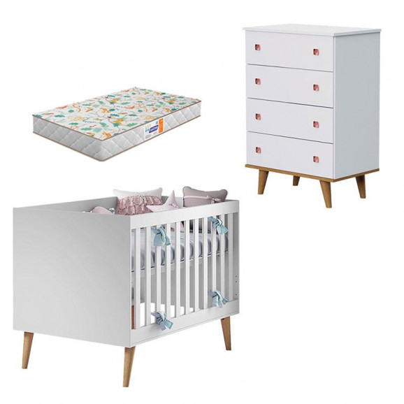 Berço Americano Ludmila e Cômoda Gaveteiro Fernanda Branco Acetinado Bétula com Colchão Gazin – Carolina Baby