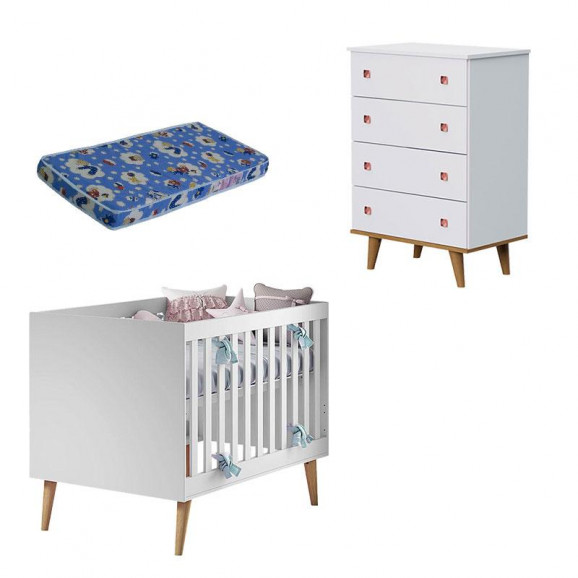 Berço Americano Ludmila e Cômoda Gaveteiro Fernanda Branco Acetinado Bétula com Colchão Ortobom – Carolina Baby