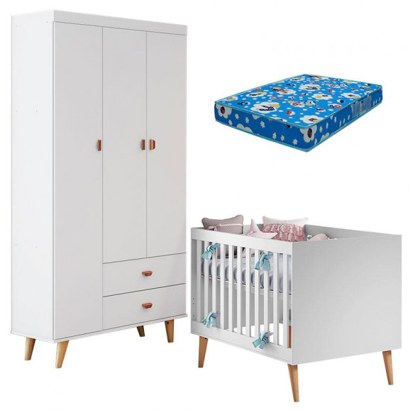 Berço Americano Ludmila e Guarda Roupa 3 Portas Duda Branco Acetinado Bétula com Colchão Ortobom - Carolina