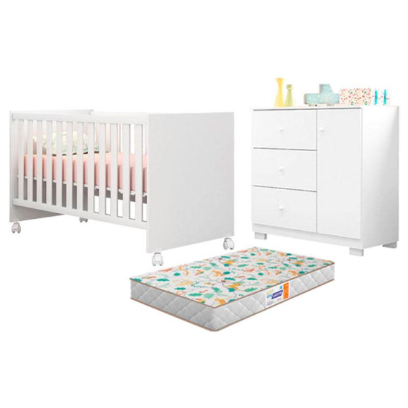 A mamãe está procurando móveis para montar o quartinho do seu bebê? Então apresentamos para você este belo conjunto composto pelo berço americano da linha Doce Sonho 100 fabricado pela Qmovi acompanhado do colchão Gazin e a cômoda infantil da linha Duda fabricado pela Phoenix Baby. O berço oferece a opção de acompanhar o crescimento do seu filho, se tornando uma mini cama. A cômoda possui três gavetas e uma porta, ideal para a mamãe acomodar as roupinhas e acessórios do seu filho. Desenvolvidos em MDP/ MDF da mais alta qualidade, garante durabilidade e resistência. Esse conjunto agrega sofisticação e conforto para o bebê. Além disso, foi cuidadosamente projetado para acompanhar todas as fases de crescimento do seu filho. Confira as características: