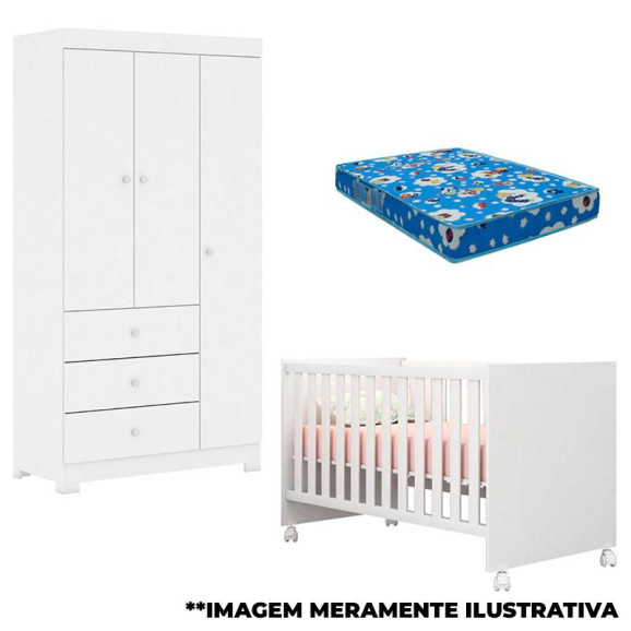 Berço Americano Mini Cama Doce Sonho 100 e Guarda Roupa Infantil Duda 3 Portas Branco Brilho com Colchão – Phoenix Baby