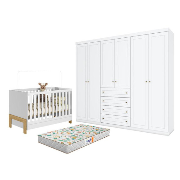 Berço Americano Mini Cama Fantasia Branco Acetinado – Qmovi e Guarda Roupa Casal Americano 6 Portas Branco HP com Colchão Gazin – Henn