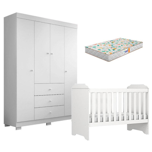 Berço Americano Mini Cama Mel e Guarda Roupa Duda 4 Portas Branco Brilho com Colchão Gazin – Phoenix Baby