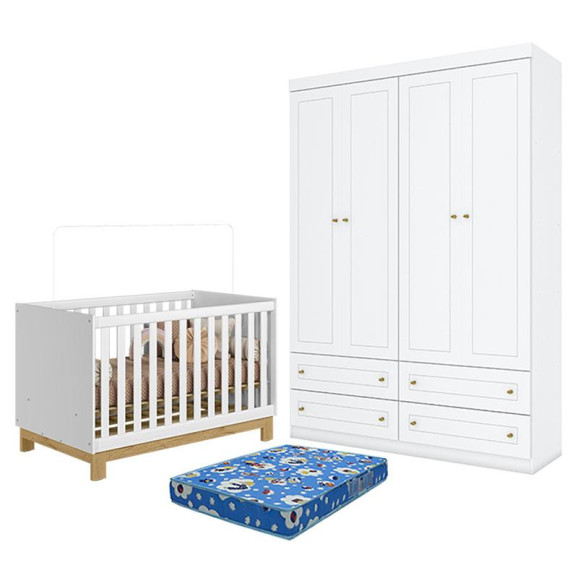 Berço Americano Mini Cama Q Encanto Slim Branco Acetinado - Qmovi e Guarda Roupa Infantil Americano 4 Portas Branco HP com Colchão TendTudo – Henn