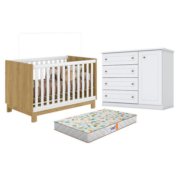 Berço Americano Mini Cama Q Encanto Slim Freijó Branco Acetinado - Qmovi e Cômoda Infantil Americano Branco HP com Colchão Gazin - Henn