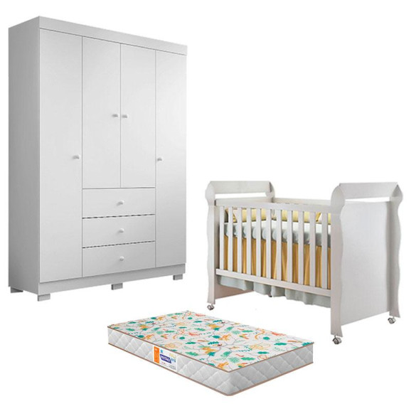 Berço Americano Mirelle e Guarda Roupa 4 Portas Duda Branco Brilho com Colchão Gazin – Phoenix Baby