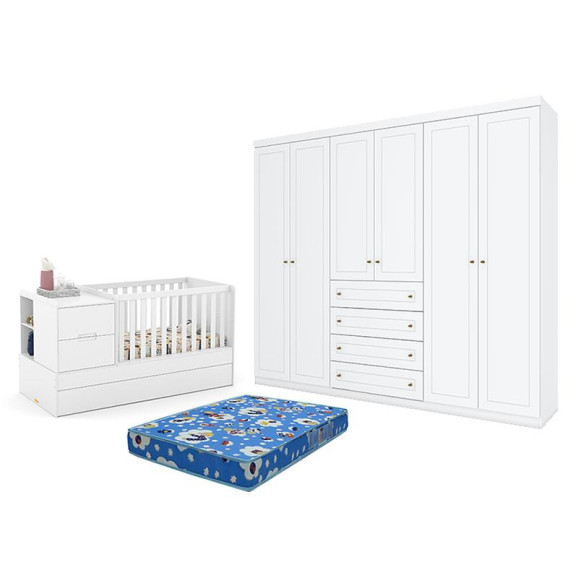 Berço Americano Multifuncional Formare Branco Acetinado – Matic e Guarda Roupa Casal Americano 6 Portas Branco HP com Colchão TendTudo - Henn