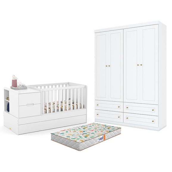 Berço Americano Multifuncional Formare Branco Acetinado – Matic e Guarda Roupa Infantil Americano 4 Porta Branco HP com Colchão Gazin - Henn