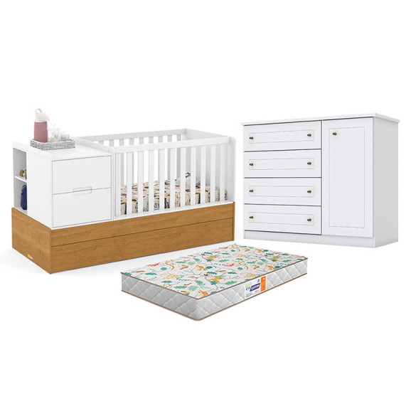 Berço Americano Multifuncional Formare Branco Freijó - Matic e Cômoda Infantil Americano Branco HP com Colchão Gazin - Henn