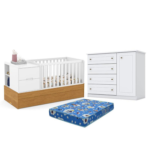 Berço Americano Multifuncional Formare Branco Freijó - Matic e Cômoda Infantil Americano Branco HP com Colchão TendTudo - Henn