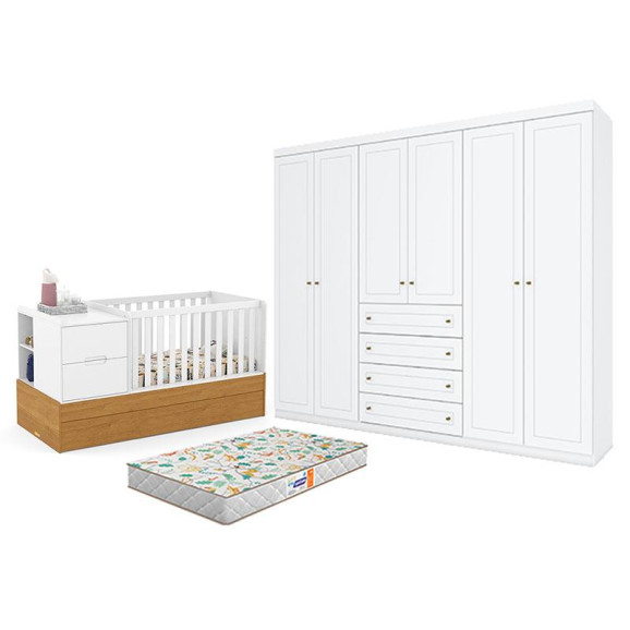 Berço Americano Multifuncional Formare Branco Freijó - Matic e Guarda Roupa Casal Americano 6 Portas Branco HP com Colchão Gazin - Henn