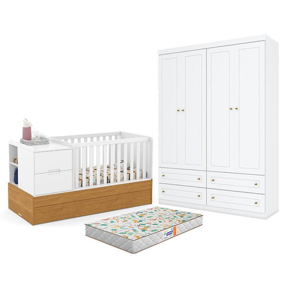 Berço Americano Multifuncional Formare Branco Freijó - Matic e Guarda Roupa Infantil Americano 4 Porta Branco HP com Colchão Gazin - Henn
