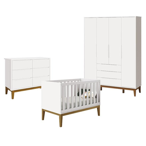 Berço Americano New Classic com Cômoda Classic e Guarda Roupa Classic Elfe Branco Acetinado com Pés Madeira - Reller