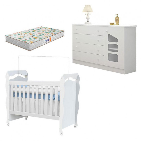 Quer fazer uma boa escolha na hora de montar o quartinho do seu bebê e não sabe muito bem por onde começar? Muitas mamães passam por esse momento e pensando nisso preparamos várias opções para te auxiliar. Berço Americano New Nanda que transforma - se em Mini Cama e ainda possui varão para mosquiteiro, Cômoda Eloisa na cor Branco brilho, um amplo espaço com prateleiras para facilitar a organização dos acessórios do seu pequeno e ainda acompanha um confortável Colchão Gazin, com maciez proporcionando uma noite de sono tranquila e agradável. Aproveite!