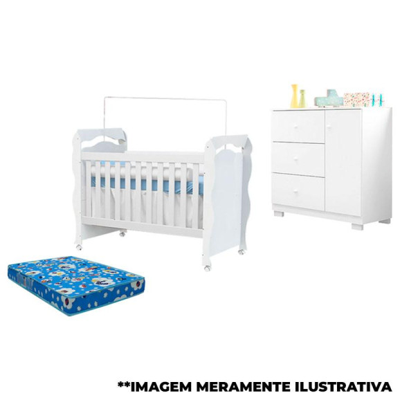 Está procurando os móveis para montar o quartinho do seu bebê? Então apresentamos para você este belo conjunto composto pelo berço americano da linha New Nanda desenvolvido pela Carolina acompanhado do colchão para berço americano e a cômoda da linha Duda desenvolvido pela Phoenix Baby. O berço pode ser utilizado como mini cama conforme seu filho cresce, prolongando a sua vida útil. A cômoda possui três gavetas e uma porta contando com um amplo espaço interno para a mamãe guardar as roupinhas e acessórios. Fabricados em 100% MDF da mais alta qualidade, garante mais durabilidade e resistência. Sendo o conjunto perfeito para acompanhar todas as fases de crescimento do seu filho. Confira as características: