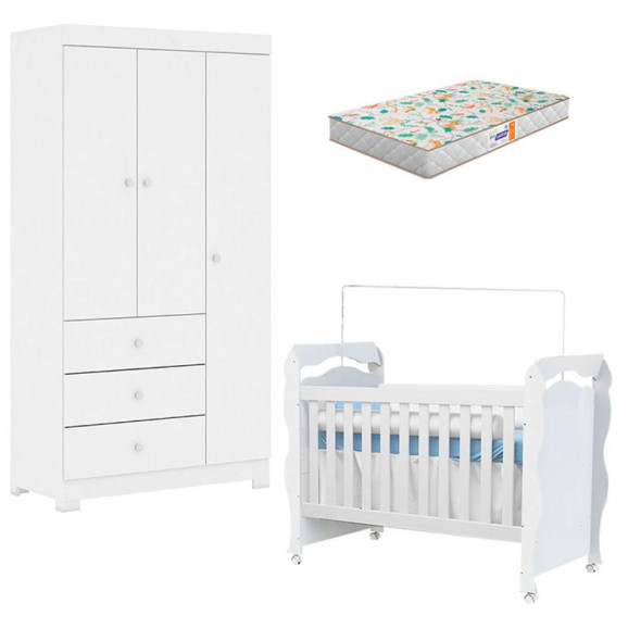 Berço Americano New Nanda e Guarda Roupa Duda 3 Portas Branco Brilho com Colchão Gazin – Phoenix Baby