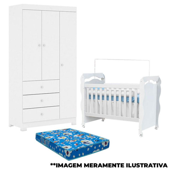 Berço Americano New Nanda e Guarda Roupa Duda 3 Portas Branco Brilho com Colchão – Phoenix Baby