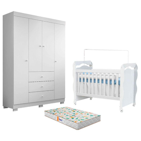 Berço Americano New Nanda e Guarda Roupa Duda 4 Portas Branco Brilho com Colchão Gazin – Phoenix Baby