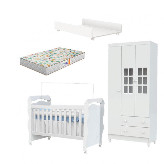 Pensando em te auxiliar na montagem do quartinho do bebê separamos aqui vários tipos de modelos com lindo design. Móveis fabricados especialmente para oferecer conforto e modernidade ao ambiente. Vamos lá?! Temos Berço Americano New Nanda que transforma - se em Mini Cama acompanhando as fases de crescimento do bebê, Trocador Juju na cor Branco Brilho fabricado pela Reller, pensado para oferecer mais praticidade na hora de trocar as fraldinhas. Um Lindo Guarda Roupa com 3 Portas e 2 Gavetas Mariah, um amplo espaço com prateleiras para facilitar na organização das roupinhas e ainda acompanha um lindo Colchão Gazin, desenvolvido para oferecer conforto e uma noite de sono mais tranquila para seu pequeno. Confira mais detalhes desses produtos e se liga nos precinhos que preparamos para você. Aproveite!