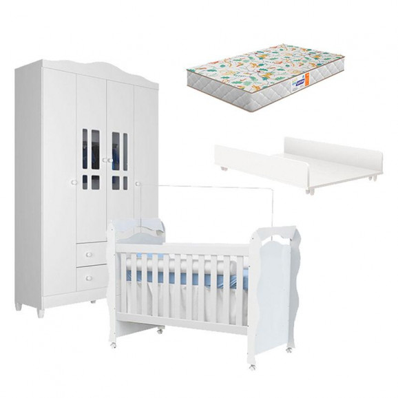 Berço Americano New Nanda Guarda Roupa Ariel 4 Portas e Trocador Juju Branco Brilho com Colchão Gazin - Carolina