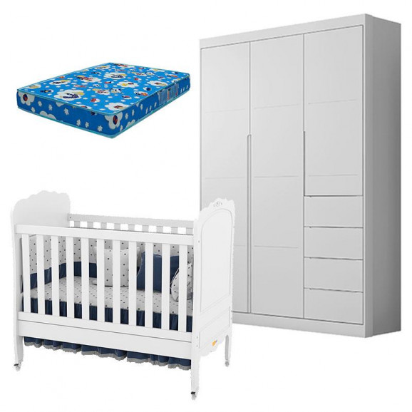 Berço Americano Provence e Guarda Roupa Infantil Eloá Branco Acetinado com Colchão Ortobom – Phoenix Baby