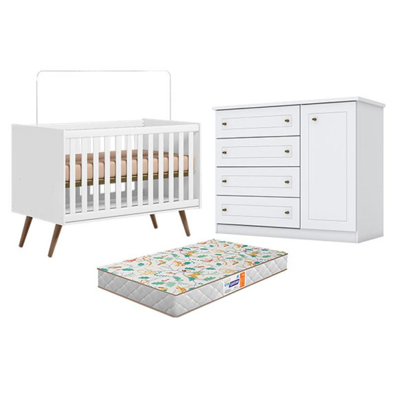 Berço Americano Q Encanto 3820 Retrô Branco Acetinado - Qmovi e Cômoda Infantil Americano Branco HP com Colchão Gazin - Henn