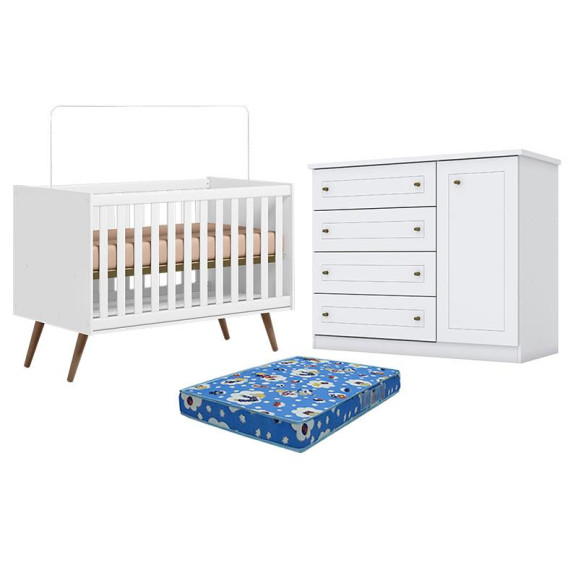 Berço Americano Q Encanto 3820 Retrô Branco Acetinado - Qmovi e Cômoda Infantil Americano Branco HP com Colchão Ortobom - Henn
