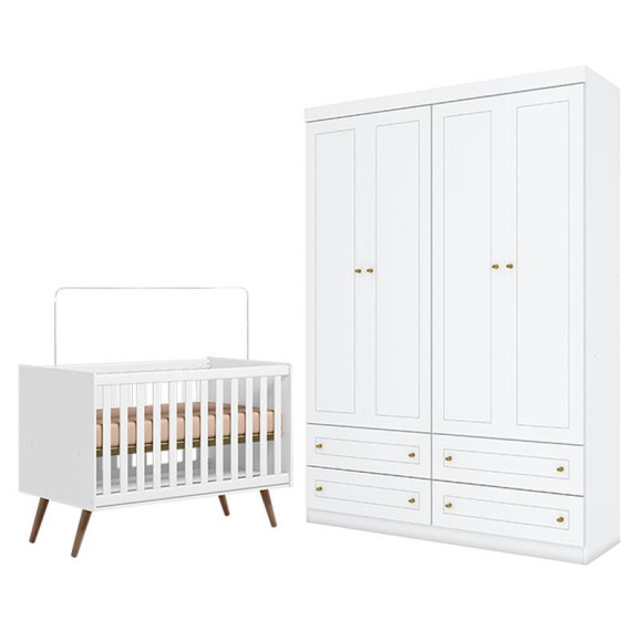 Berço Americano Q Encanto 3820 Retrô Branco Acetinado - Qmovi e Guarda Roupa Infantil Americano 4 Porta Branco HP - Henn