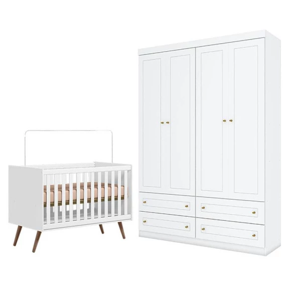 Conjunto infantil composto por Berço Americano Q Encanto 3820 Retrô Branco Acetinado Qmovi e Guarda-Roupa Infantil Americano 4 Portas Branco HP Henn. O berço possui design retrô, estrutura resistente, grades fixas e estrado com regulagem de altura, garantindo conforto e segurança para o bebê. O guarda-roupa conta com 4 portas e bom espaço interno para organizar roupas e acessórios. Ideal para um quarto de bebê funcional, moderno e aconchegante.