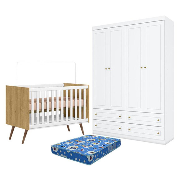 Berço Americano Q Encanto 3820 Retrô Freijó TOQ Branco Acetinado - Qmovi e Guarda Roupa Infantil Americano 4 Porta Branco HP com Colchão TendTudo - Henn