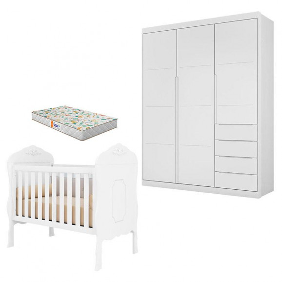 Berço Americano Realeza e Guarda Roupa Infantil Blenda Branco Acetinado com Colchão Gazin - Phoenix Baby